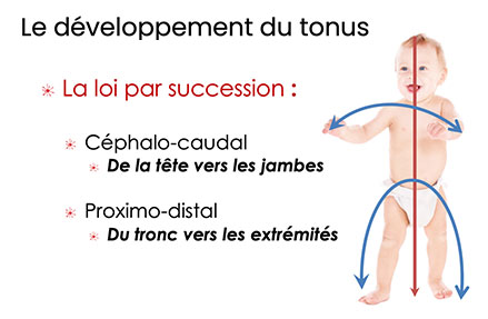 Ce tonus suit une loi de développement universelle, bien décrite par les pionniers de la neurophysiologie comme Jacques Paillard, André Thomas ou Marc Jeannerod : la loi céphalo-caudale, selon laquelle la maturation tonique se fait de haut en bas, de la tête vers les pieds. D’abord le redressement céphalique et le contrôle oculomoteur, puis la stabilisation du tronc, enfin l’intégration des appuis et de la locomotion.